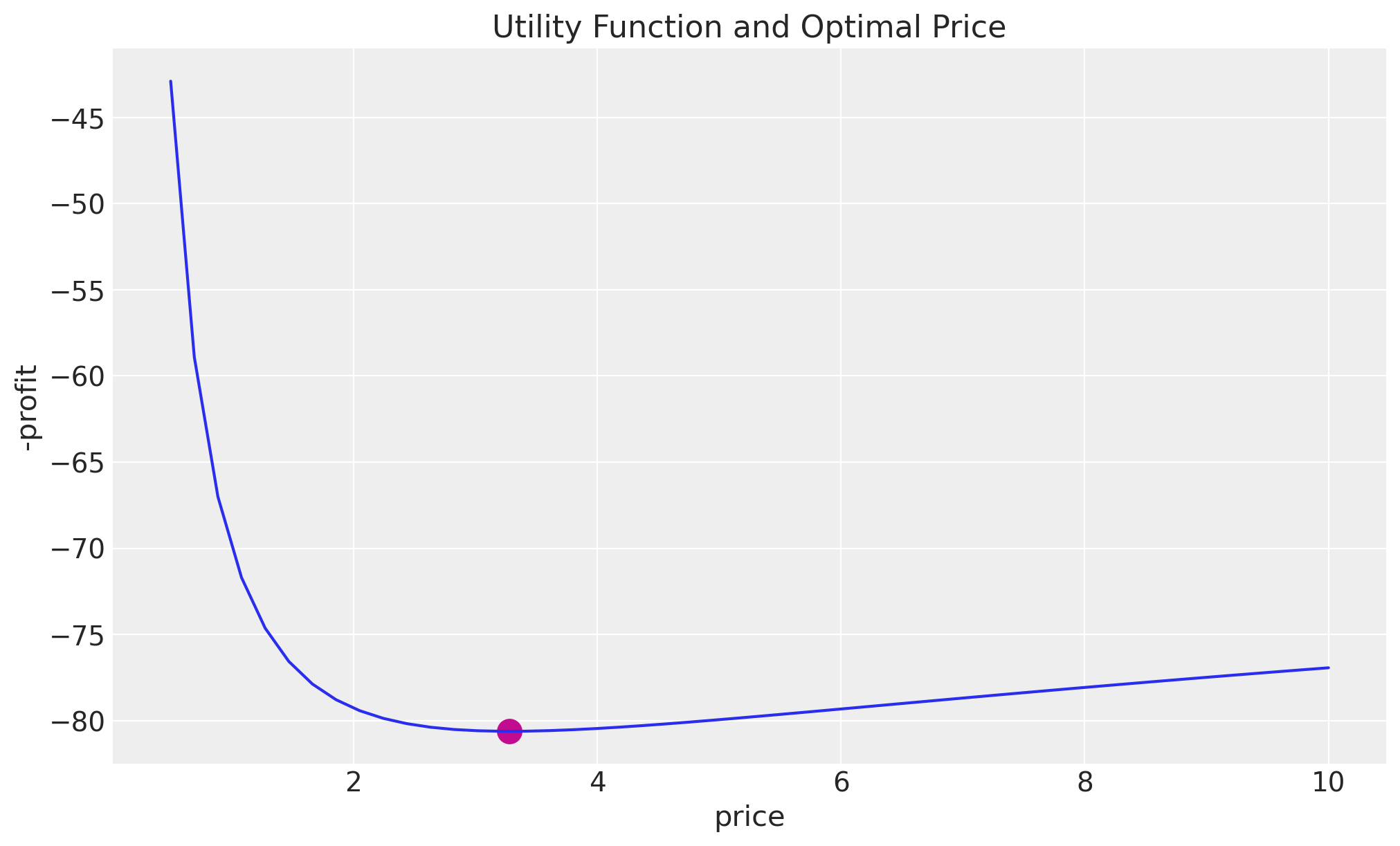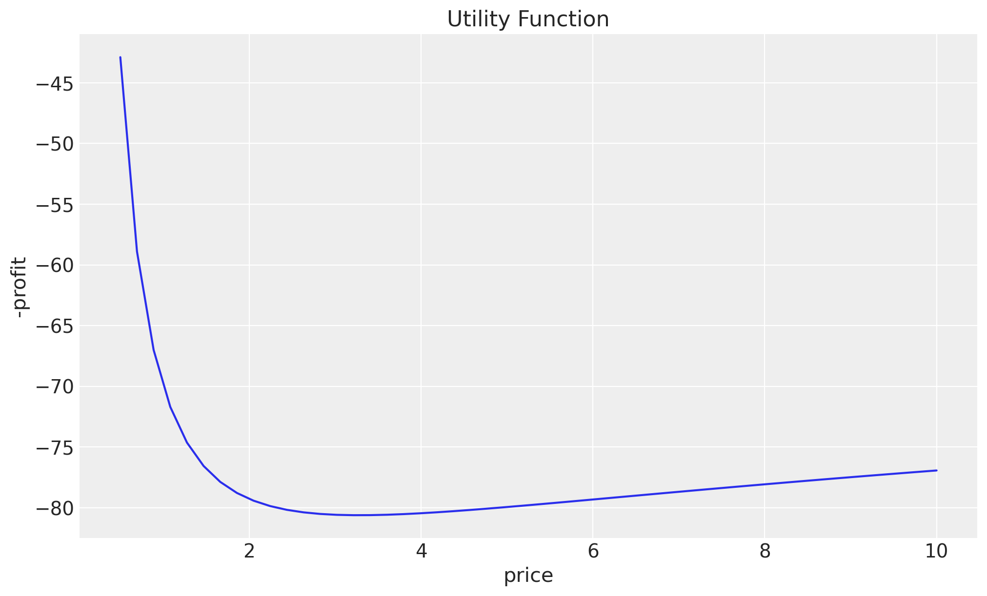 As expected from the analytical solution, the maximum profit is achieved at a price of around \(3.0\). We want to use this utility function to find the precise optimal price.