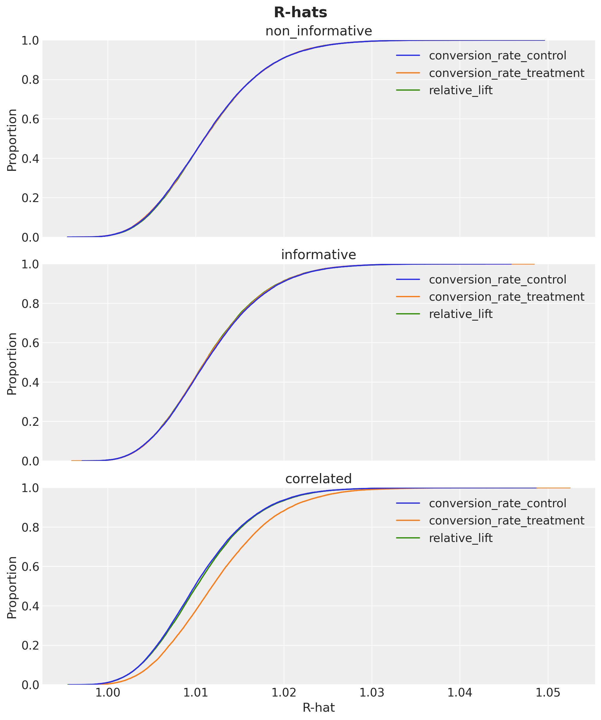 We compare three prior specifications motivated by Prior Predictive Modeling in Bayesian AB Testing (see also The Bet Test):
