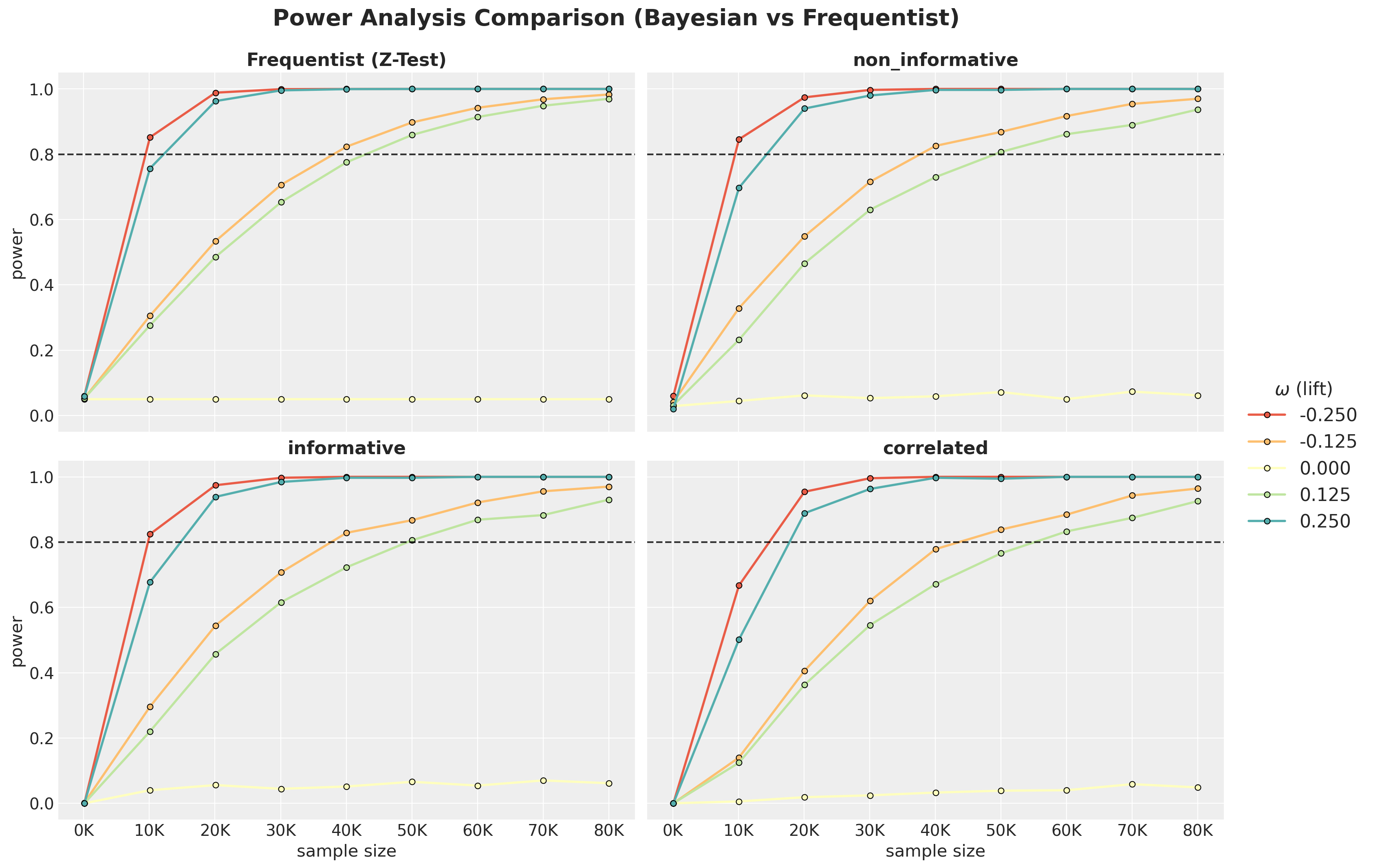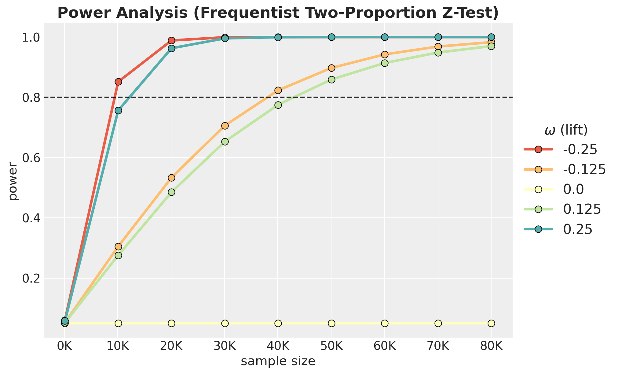 - Generate synthetic A/B test data across a grid of sample sizes and true relative lifts \(\omega\) (distributions).