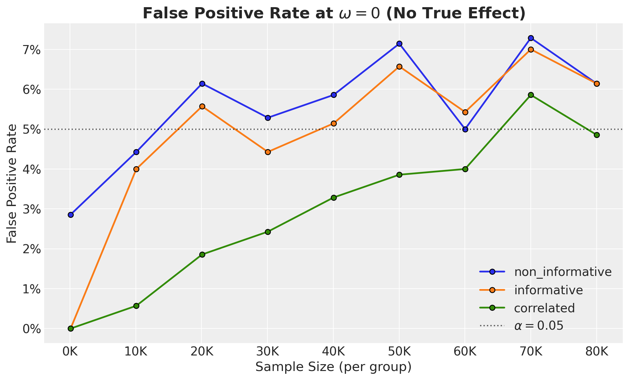 Normal(0, 0.1)prior on relative lift provides strong regularisation, but requires substantially larger samples to detect eal effects, especially when \(|\omega| > 0.2\).Non-informative Bayesian \(\approx\) Frequentist. With flat priors and a narrow ROPE, the HDI+ROPE criterion reduces to a significance test: both give \(\sim 5\%\) false-positive rates and nearly identical power curves.