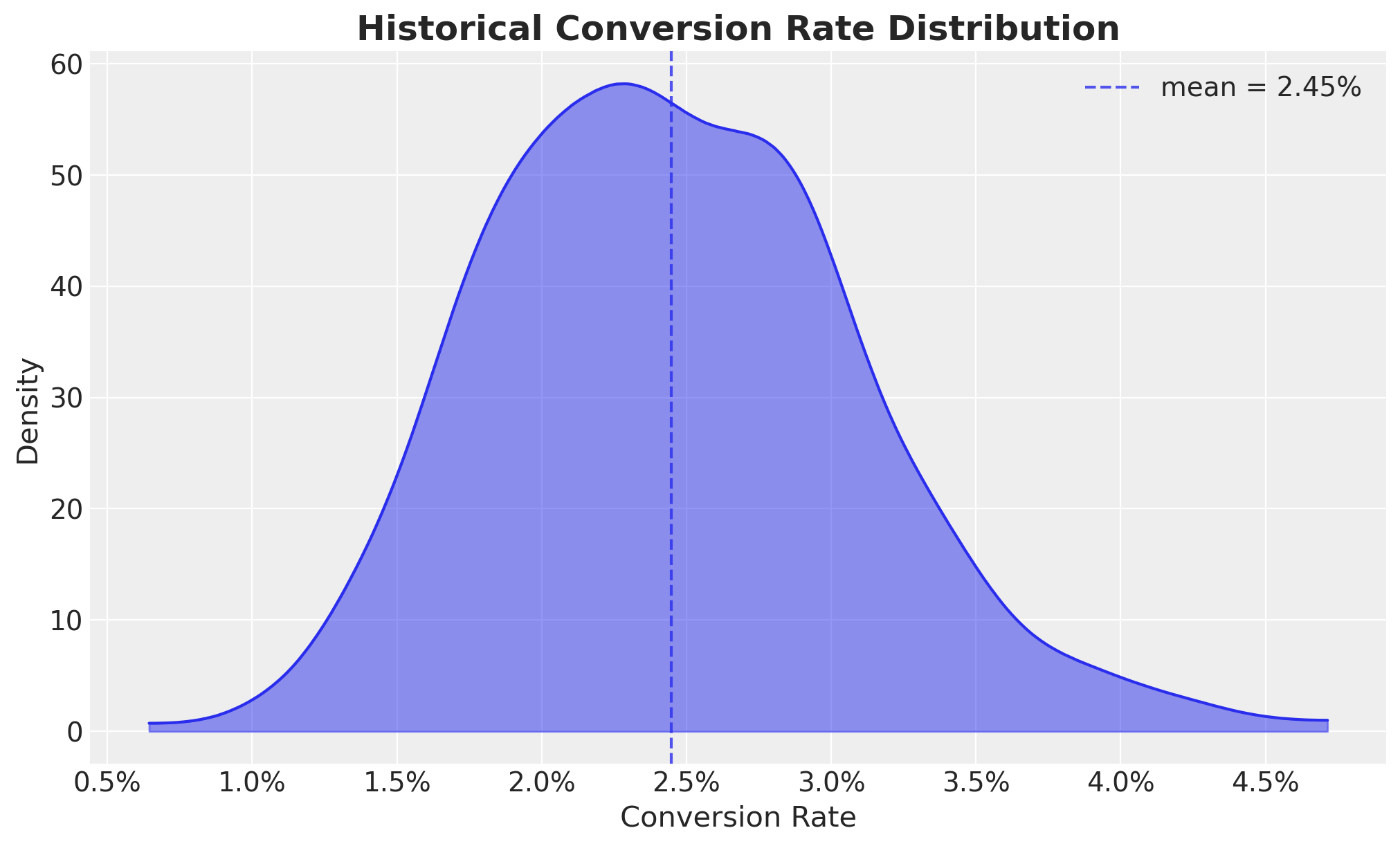 Let’s start by scoping the problem in view of an hypothetical A/B test. Let us assume the following historical conversion rate distribution: