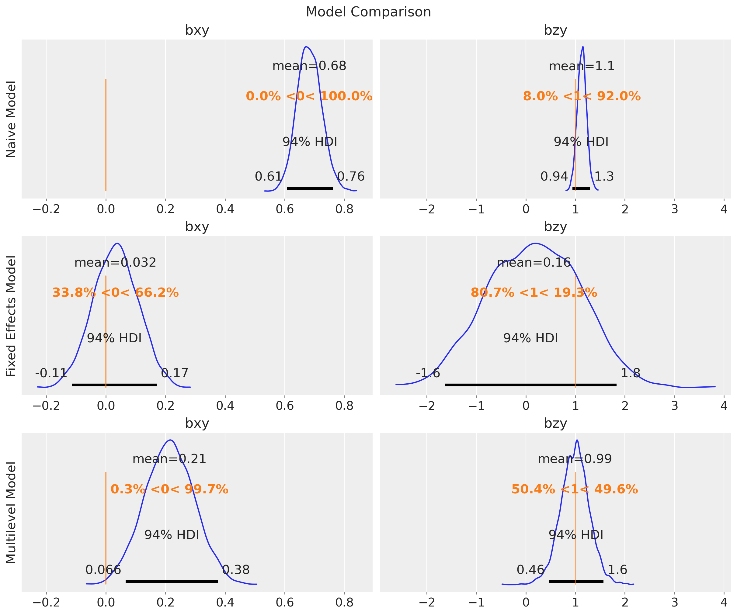 Observe that the uncertainty of \(b_{zy}\) is higher in the fixed effects model. The reason is because the intercepts and the group-level \(z\) terms are not identifiable (there are many ways to sum up two numbers to get the same group-level intercept).