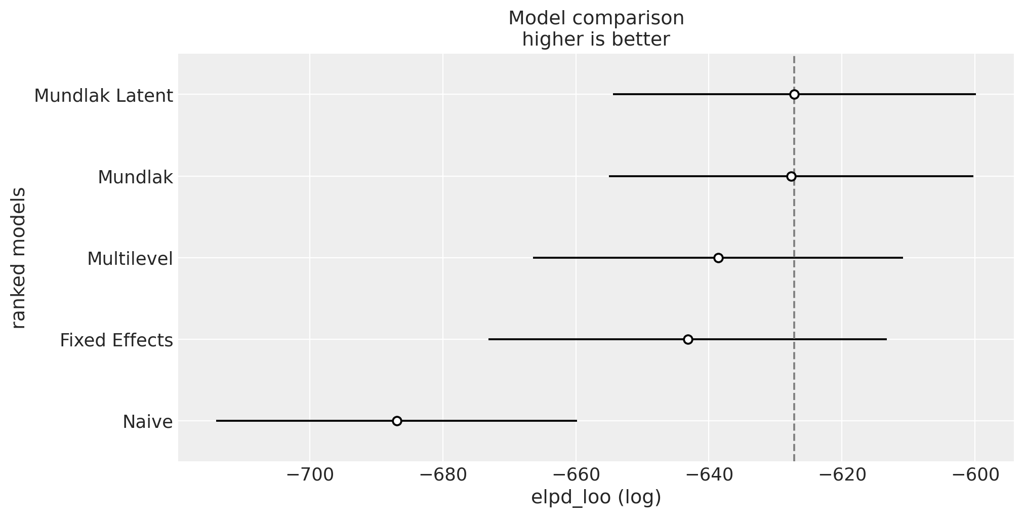 We see that the Mundlak latent model is the best model according to the LOO information criterion (but is very close to the Mundlak model).