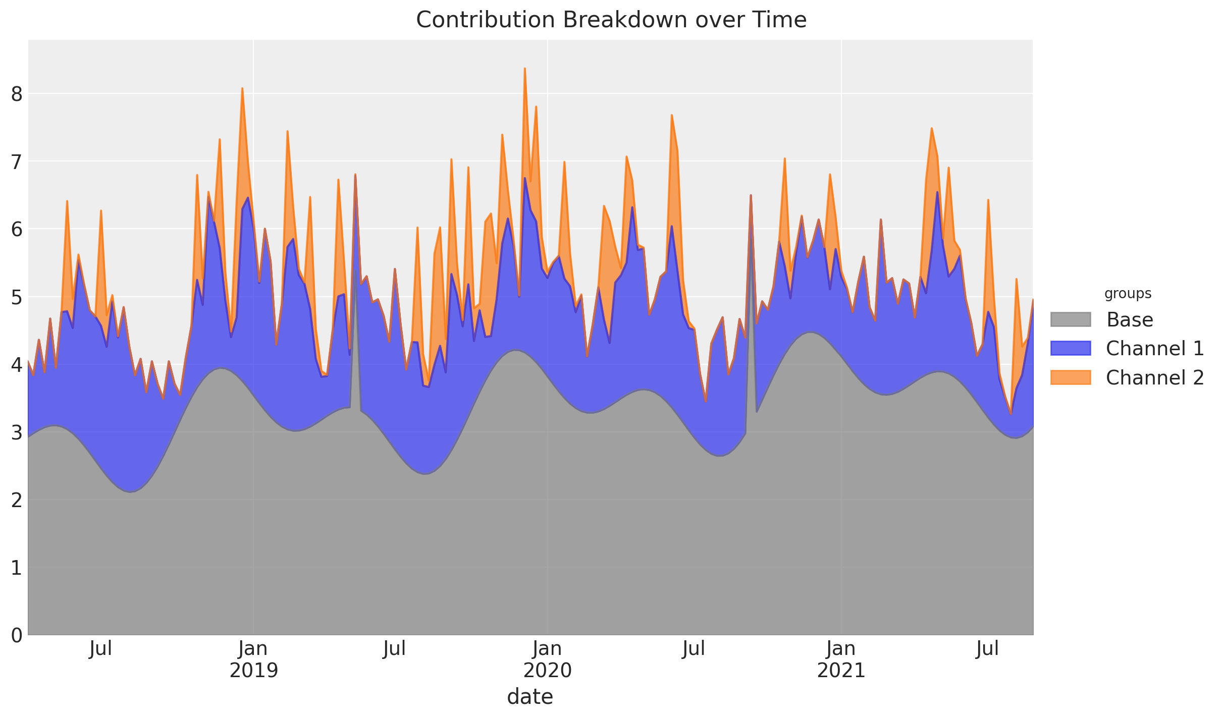 We want to understand the contribution of channels \(x_1\) and \(x_2\) spend into the target variable sales.