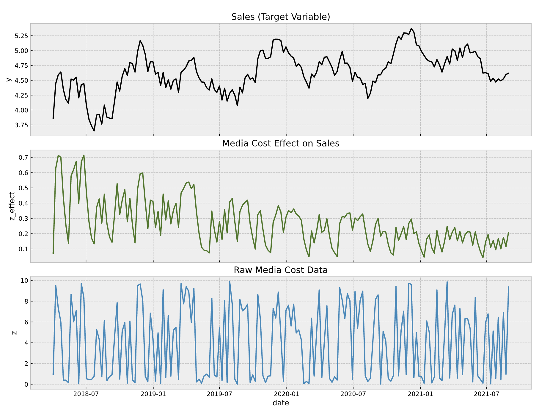 MMM structure: Media data (cost, impressions or clicks) is modeled using carryover effects (adstock) and saturation effects. In addition, one can control for seasonality and external regressors. In this example, we allow time-varying coefficients to capture the effect development over time.