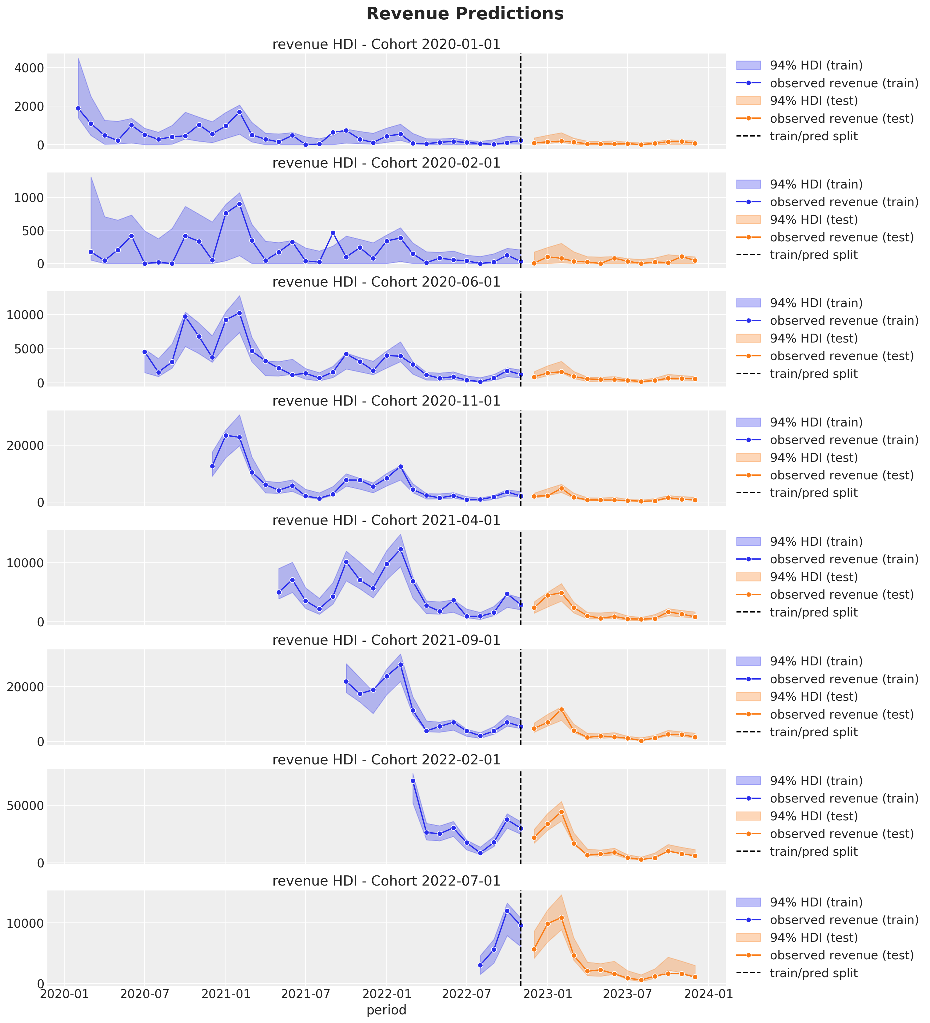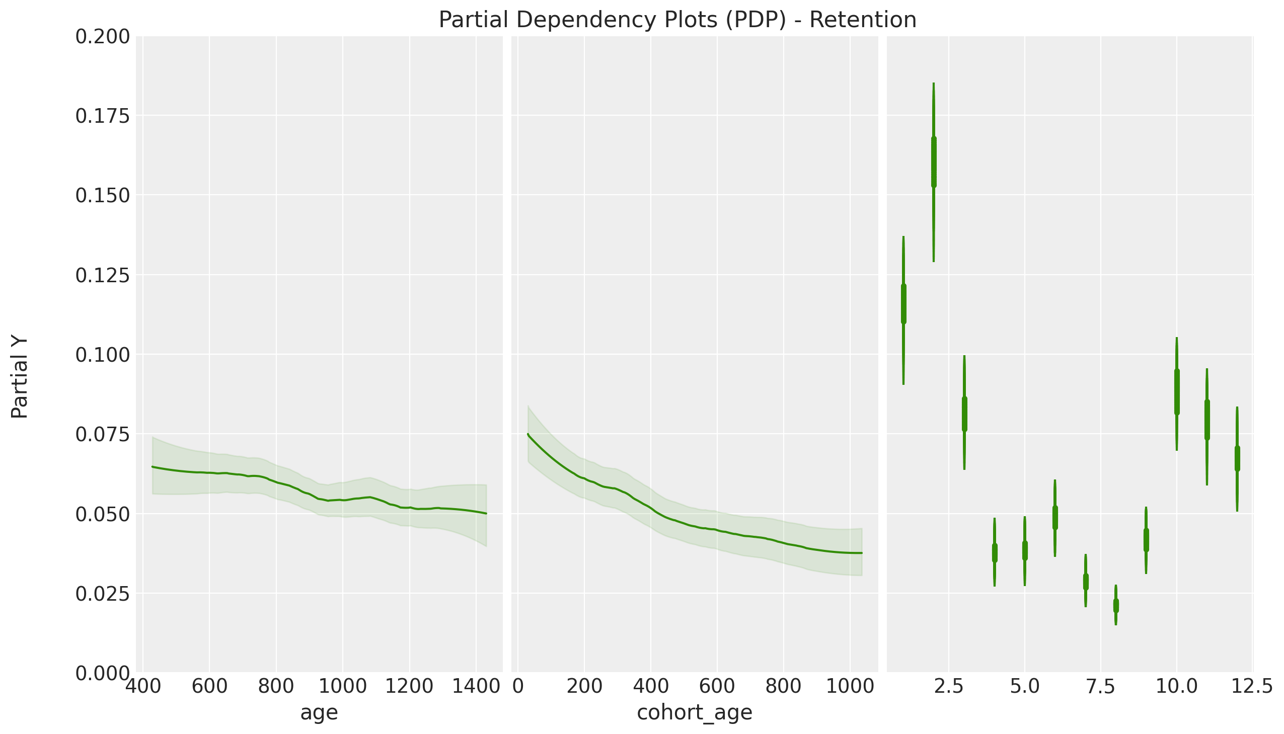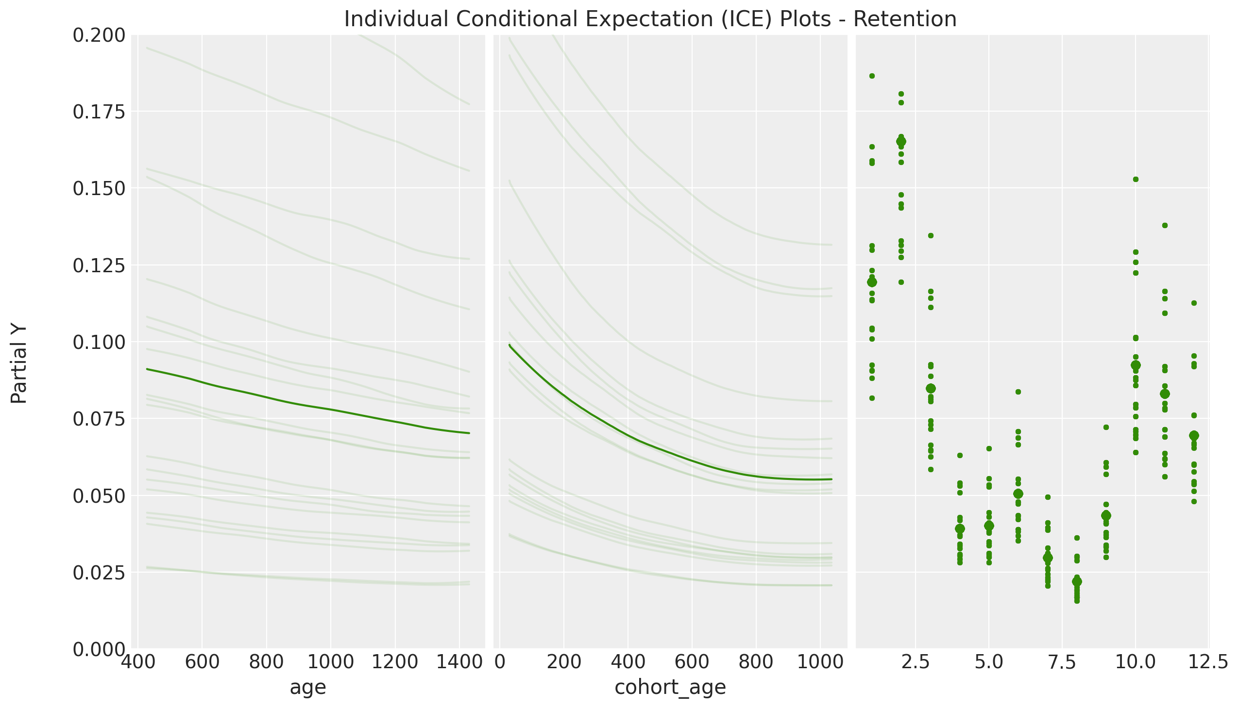 \[\begin{align*} \log(\lambda) = \: (& \text{intercept} \\ & + \beta_{\text{cohort age}} \text{cohort age} \\ & + \beta_{\text{age}} \text{age} \\ & + \beta_{\text{cohort age} \times \text{age}} \text{cohort age} \times \text{age}) \\ \text{Revenue} & \sim \text{Gamma}(N_{\text{active}}, \lambda) \end{align*}\]
