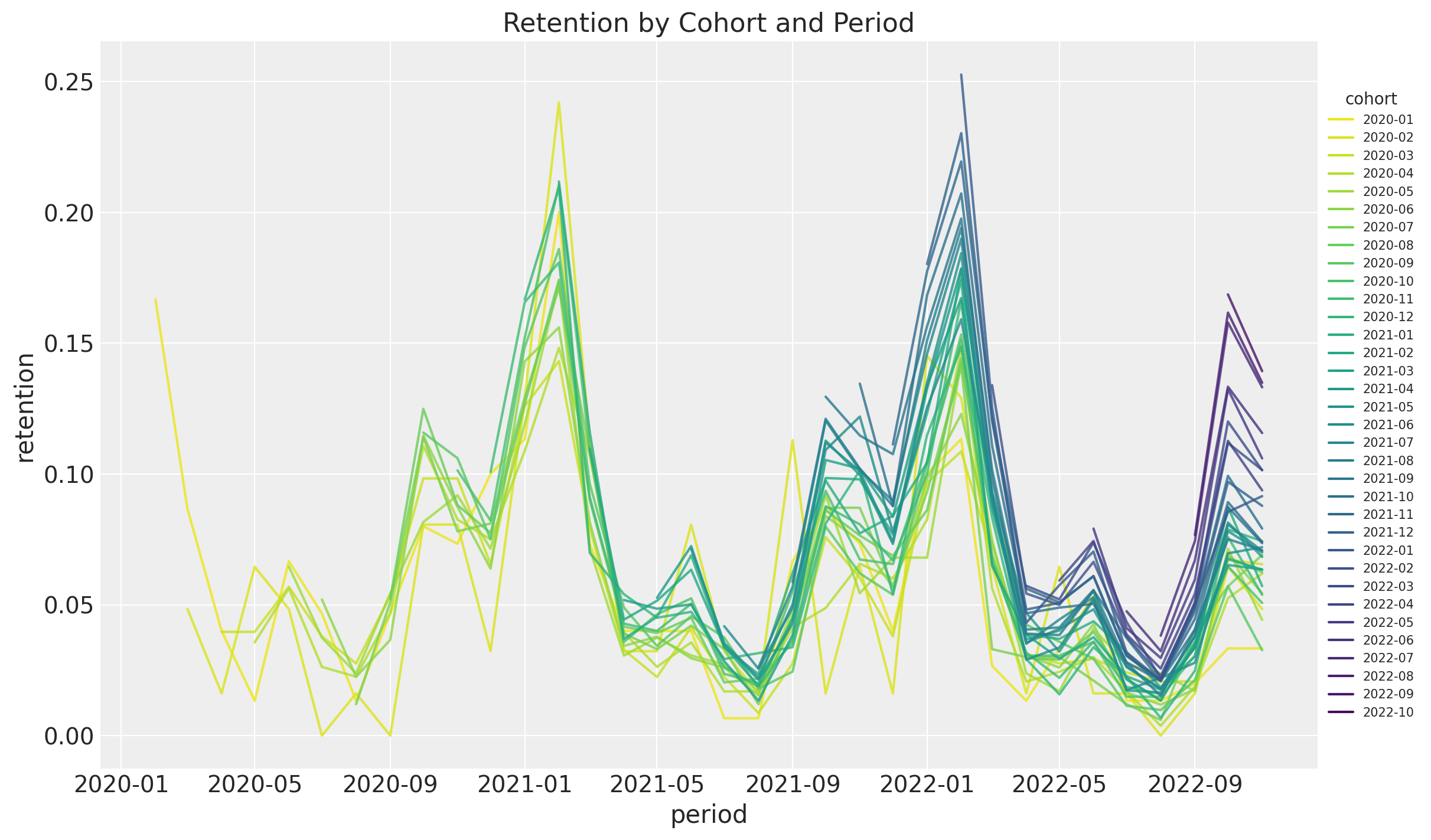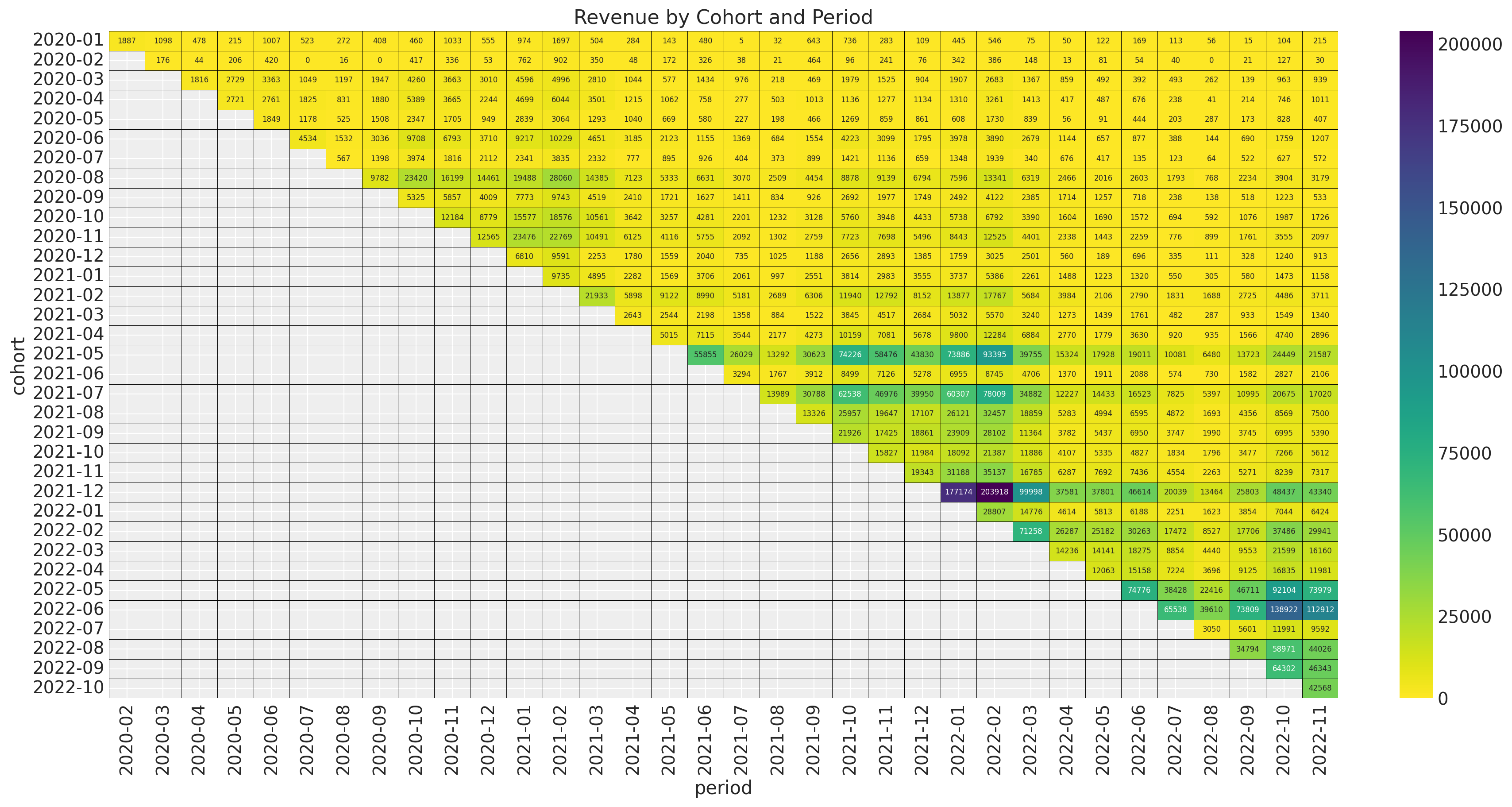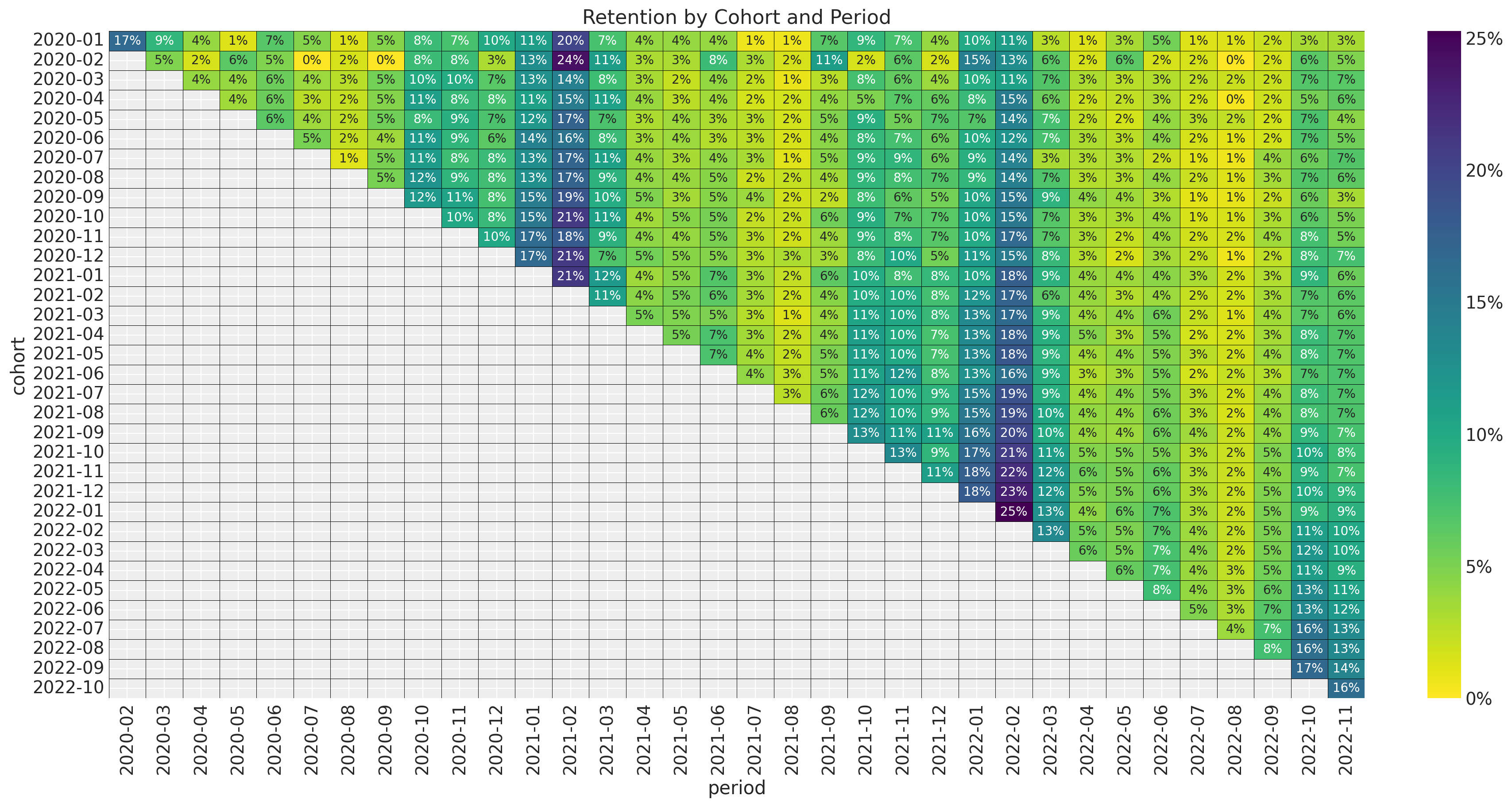 In February \(2020\), there were \(17\) users from the \(2020-01\) cohort active (e.g. did at least one purchase). The retention rate is \(17\%\).