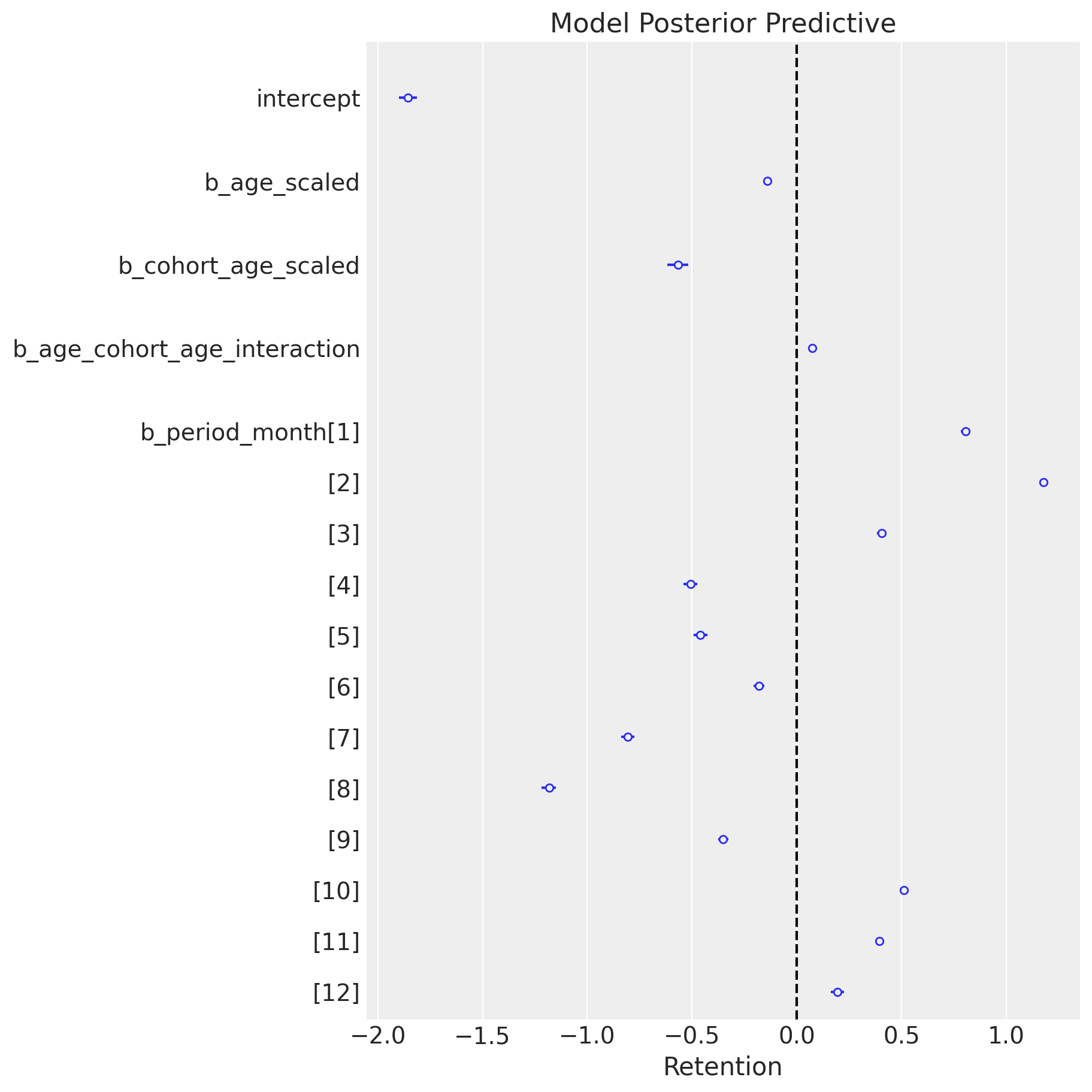 \[\begin{align*} N_{\text{active}} \sim & \: \text{Binomial}(N_{\text{total}}, p) \\ \textrm{logit}(p) = & \: ( \text{intercept} \\ & + \beta_{\text{cohort age}} \text{cohort age} \\ & + \beta_{\text{age}} \text{age} \\ & + \beta_{\text{cohort age} \times \text{age}} \text{cohort age} \times \text{age} \\ & + \beta_{\text{seasonality}} \text{seasonality} ) \end{align*}\]