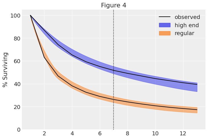 \[\begin{align*} \textrm{logit}(p) & = \text{BART}(\text{cohort age}, \text{age}, \text{month}) \\ N_{\text{active}} & \sim \text{Binomial}(N_{\text{total}}, p) \end{align*}\]