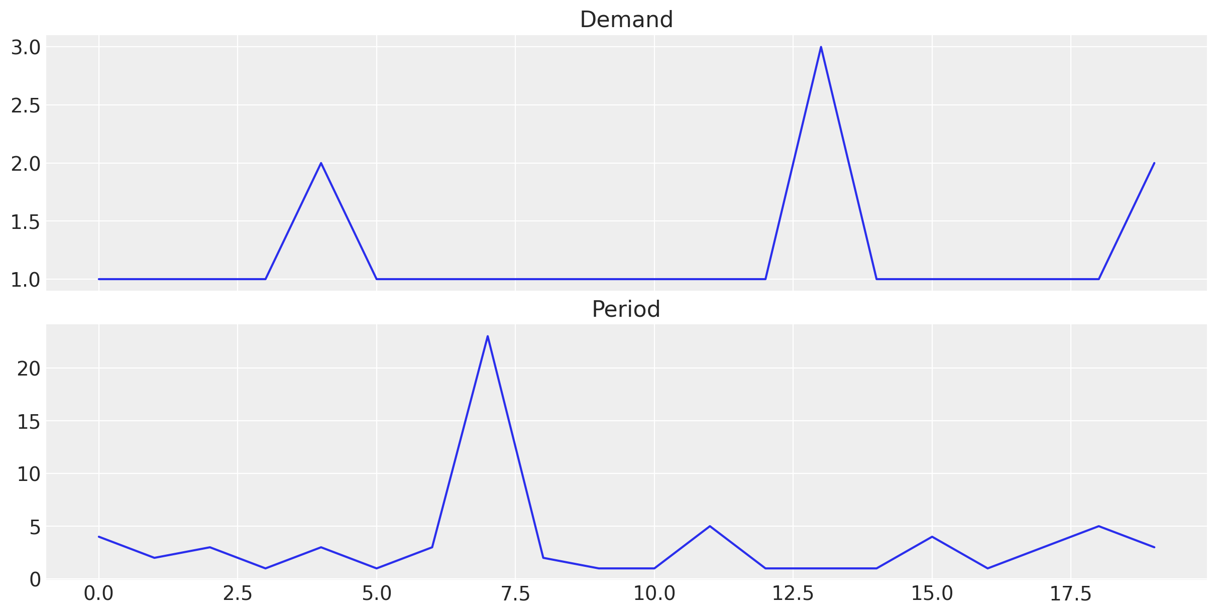 return (y[t], error), errorThe method is based on the idea of separating the demand size \(z_t\) and the demand interval \(p_t\), and then forecasting them separately using simple exponential smoothing.