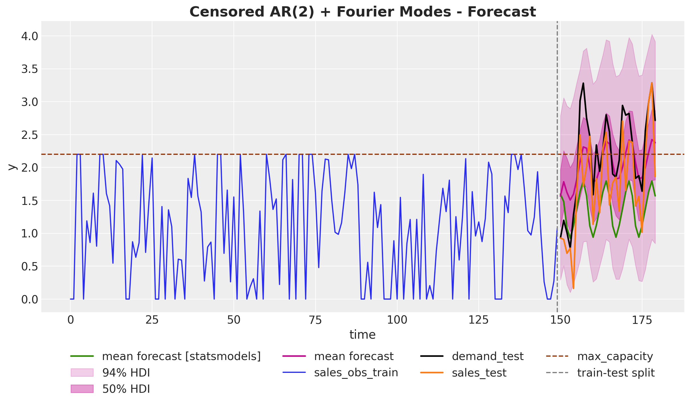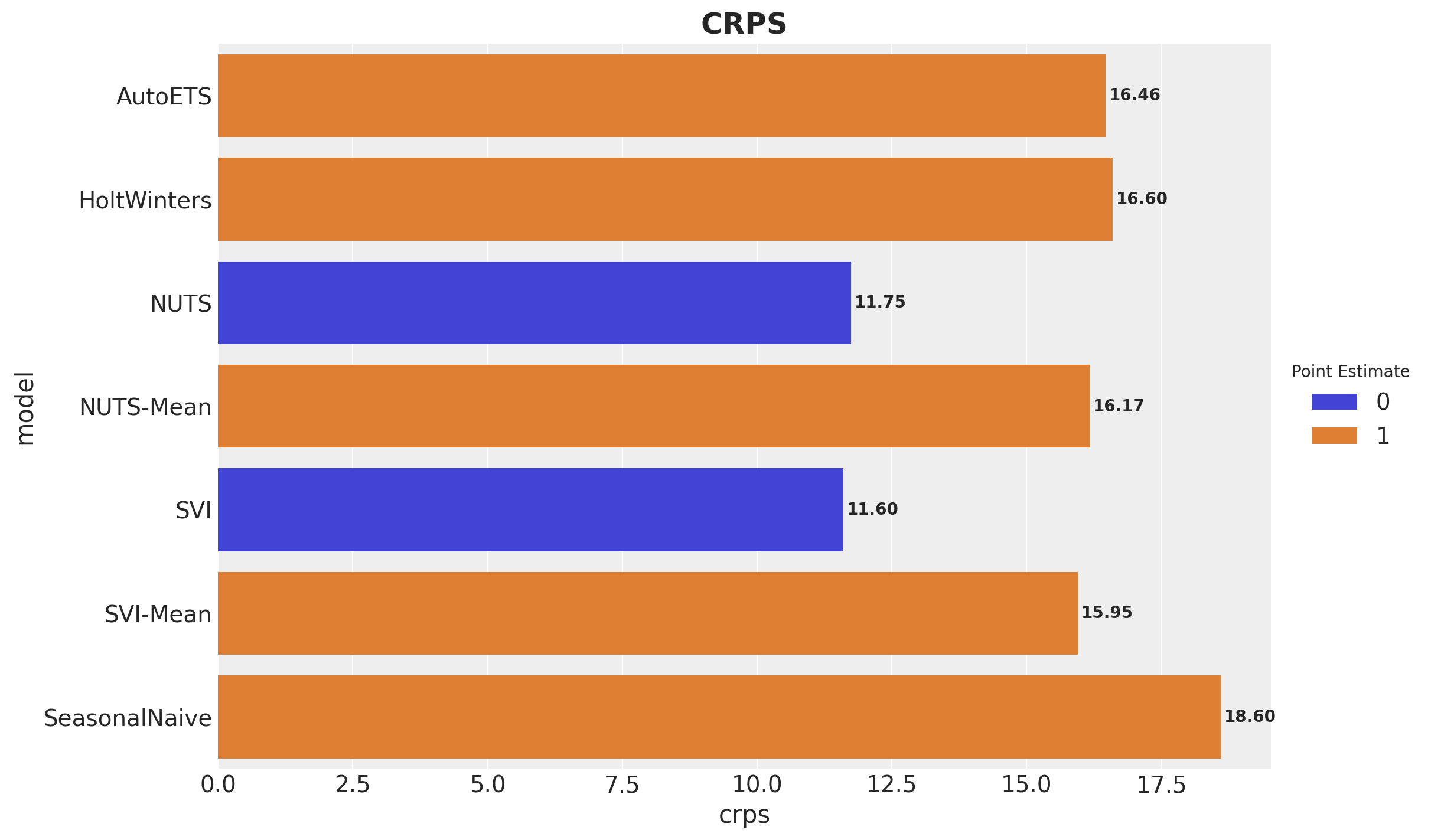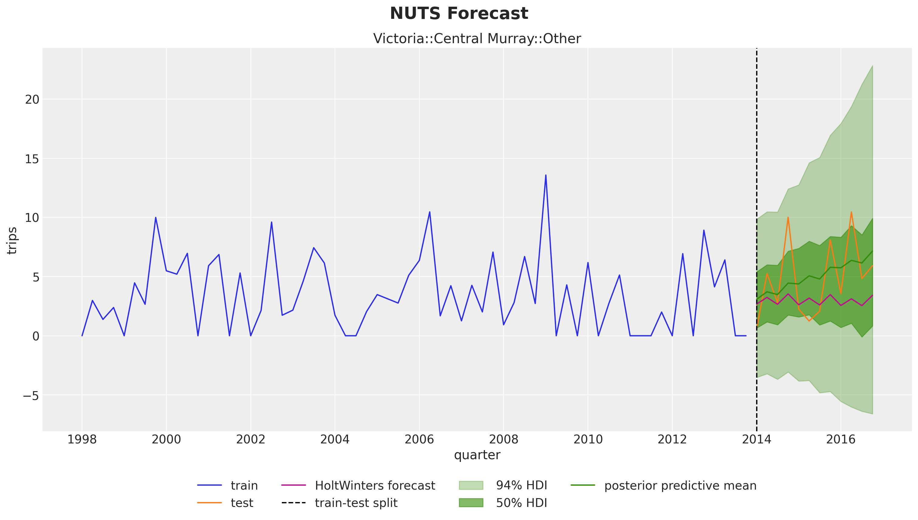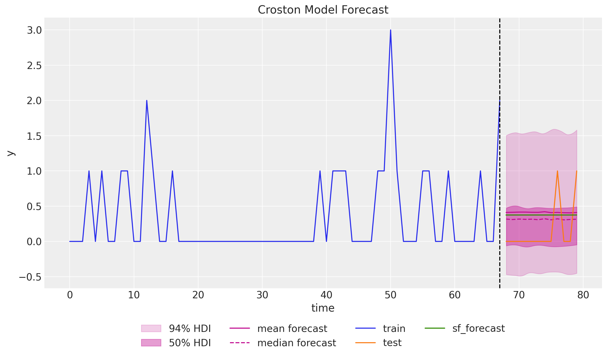 numpyro.deterministic("forecast", z_forecast * p_inv_forecast)- The TSB method is similar to the Croston’s method: constructs two different time series out of the original one and then forecast each of them separately, so that the final forecast is generated by combining the forecasts of the two time series.