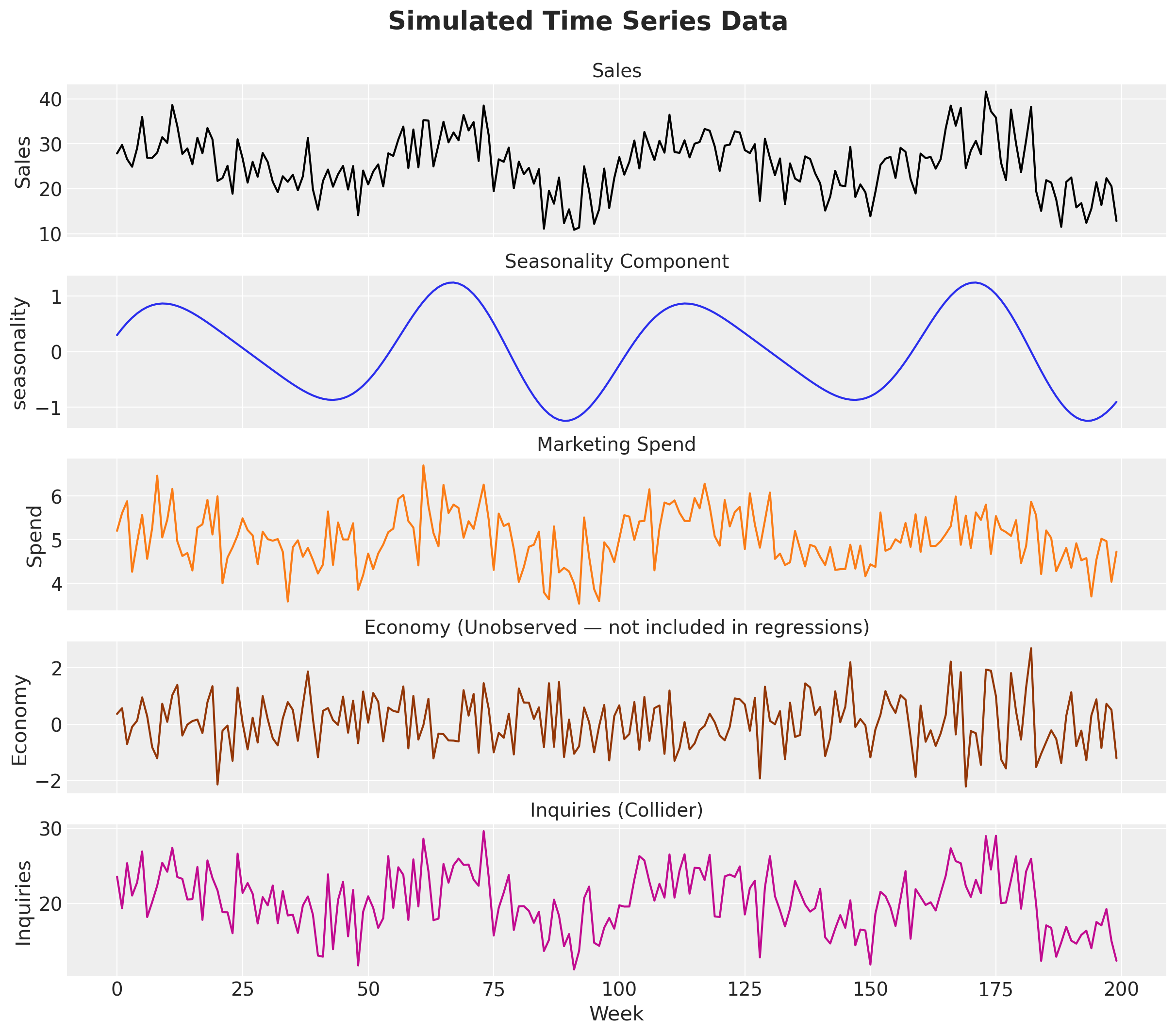 We generate \(n = 200\) weeks of data according to the causal graph above. The true causal effect of spend on sales is \(\beta_{\text{spend}} = 3\). The variable economy affects sales but is not included in either regression, introducing realistic unexplained variance. The variable inquiries is a collider (common effect of spend and sales).