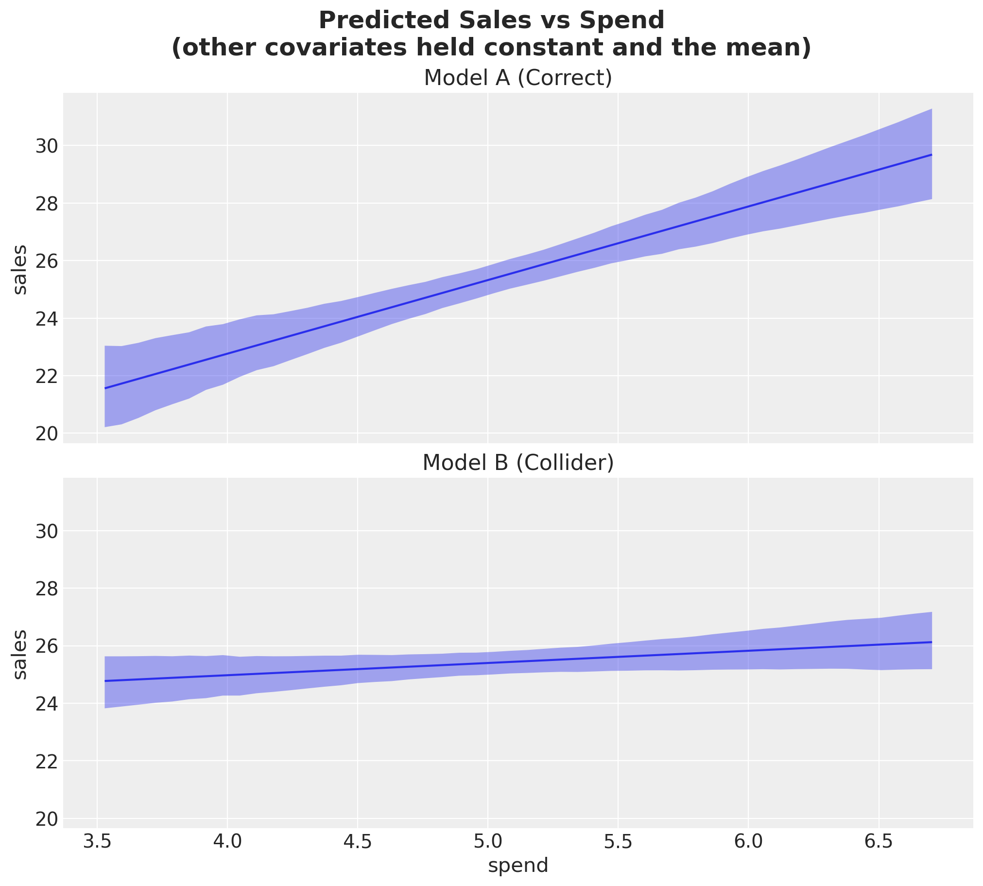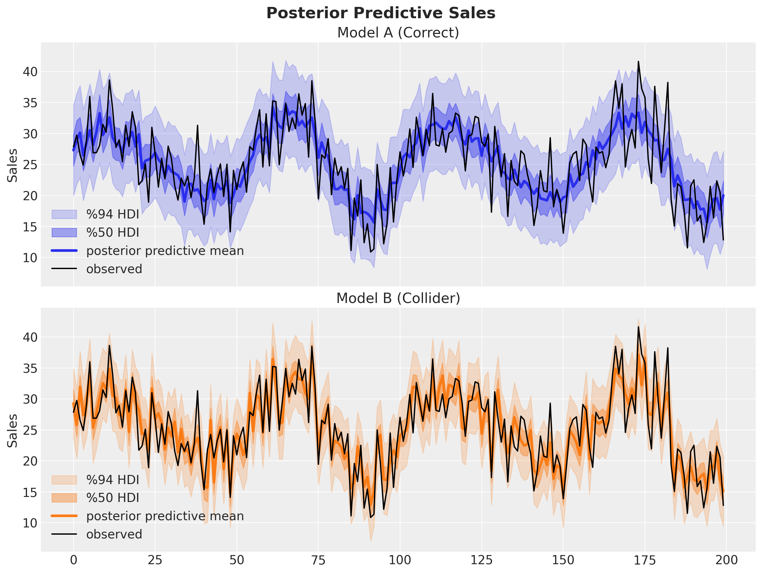 axes[1].set(title="Model B (Collider)", ylabel="Sales")