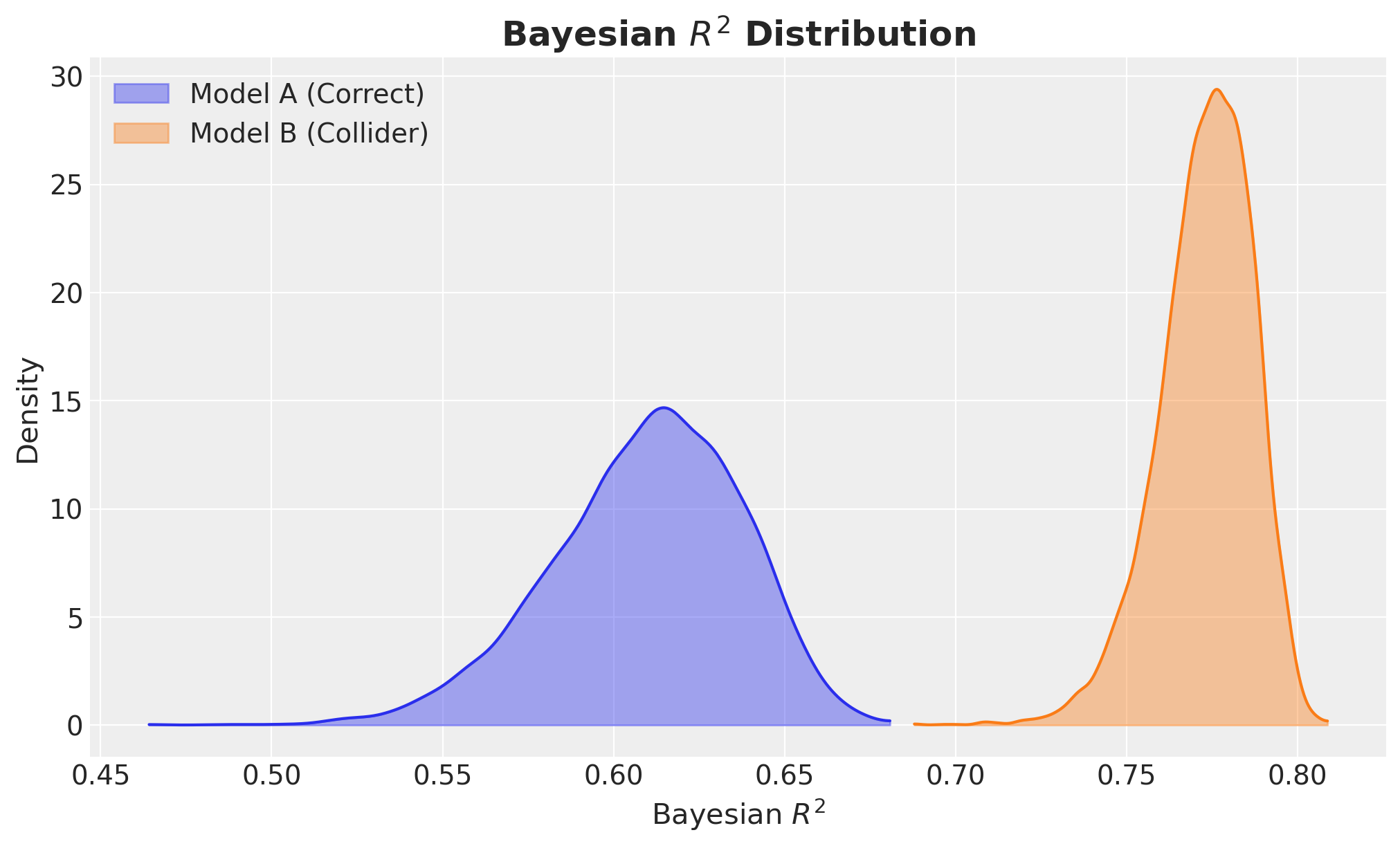 This example illustrates a fundamental point: in-sample \(R^2\) measures predictive fit, not causal accuracy. For decision making (e.g., “how much should I spend on marketing?”), we need a model that correctly estimates the causal effect, not one that maximizes \(R^2\). The structural causal model (Model A) answers the decision question correctly despite having a lower \(R^2\).