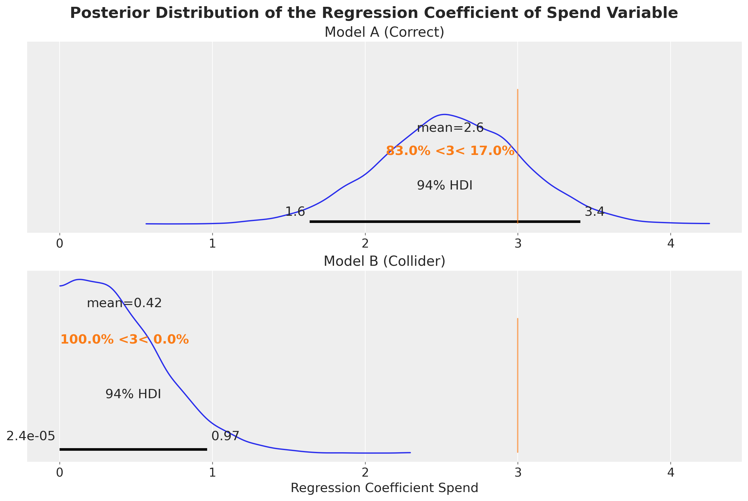 Key Observation: Model B (with the collider) has a higher \(R^2\) but a biased estimate of the causal effect of Spend. The collider variable inquiries absorbs variation in Sales (because it is partly caused by Sales), inflating \(R^2\). But conditioning on it opens a spurious path, distorting the coefficient on Spend.