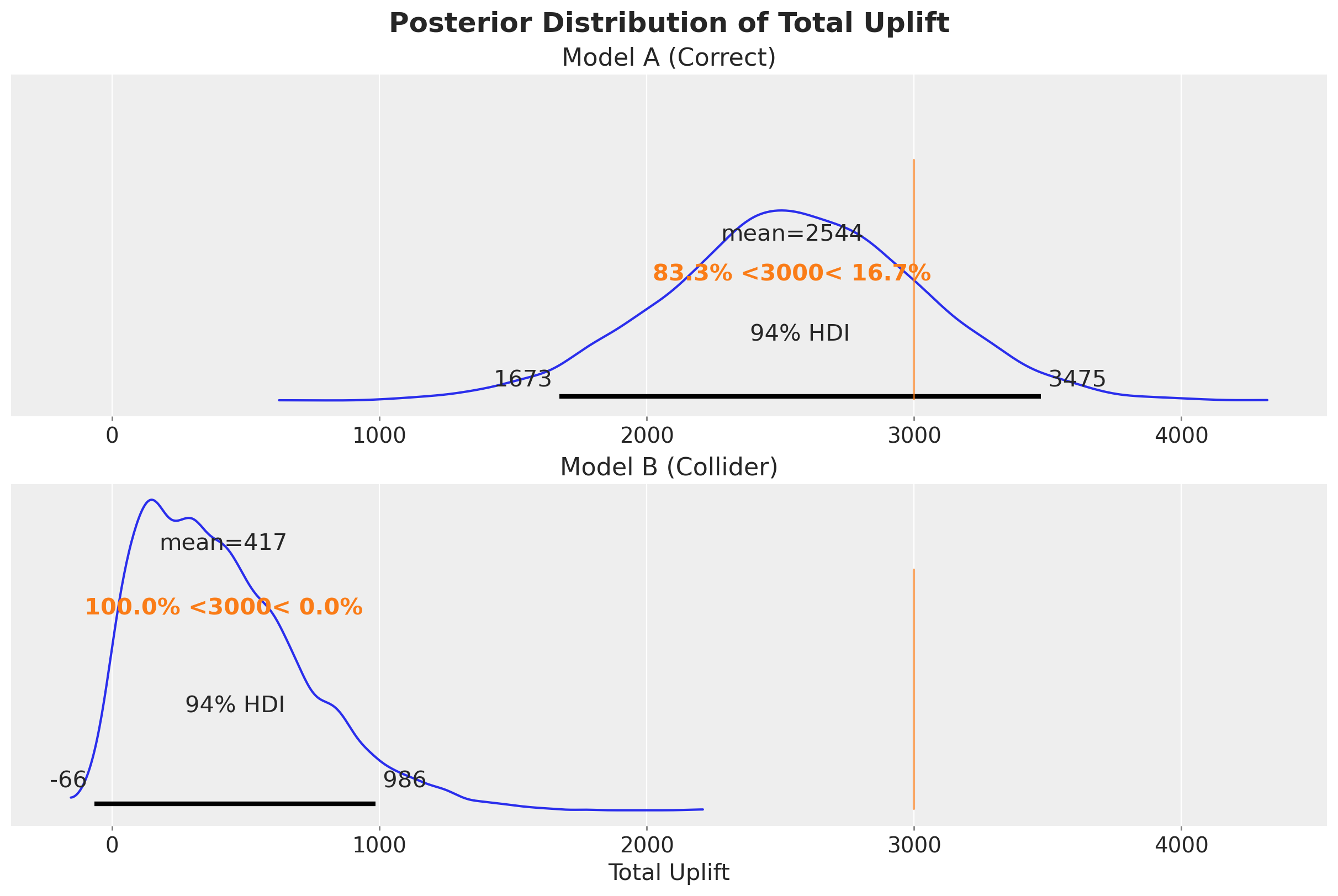 axes[1].set(title="Model B (Collider)", xlabel="Total Uplift")