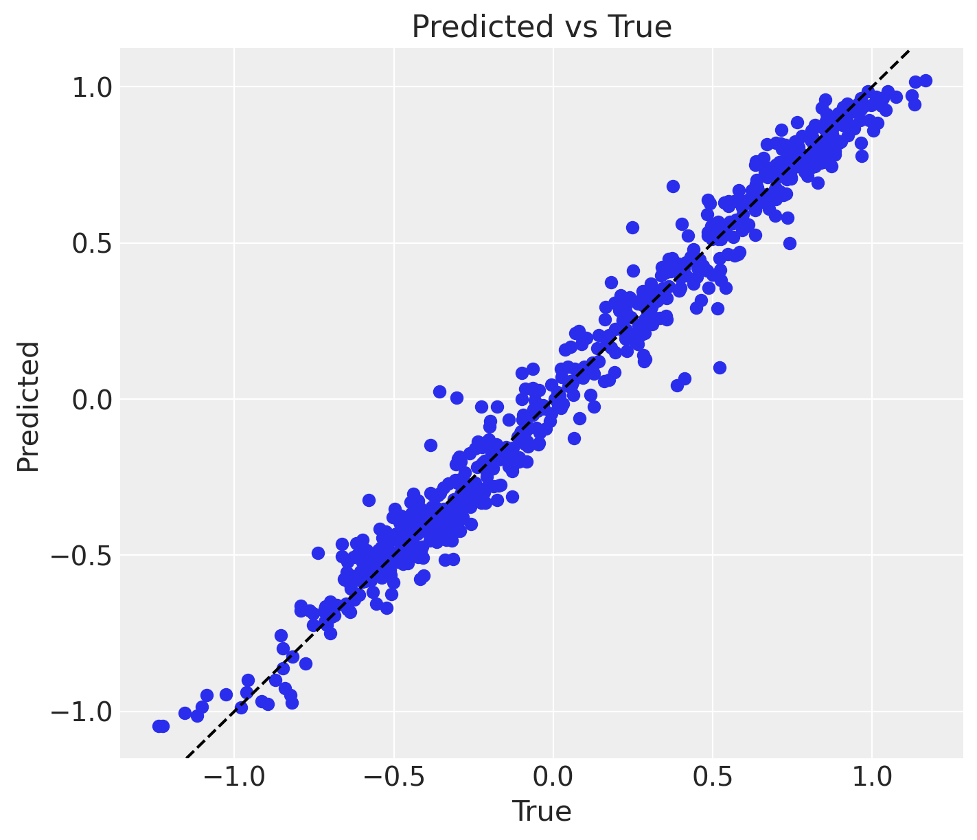 ax.set(xlabel="True", ylabel="Predicted", title="Predicted vs True");