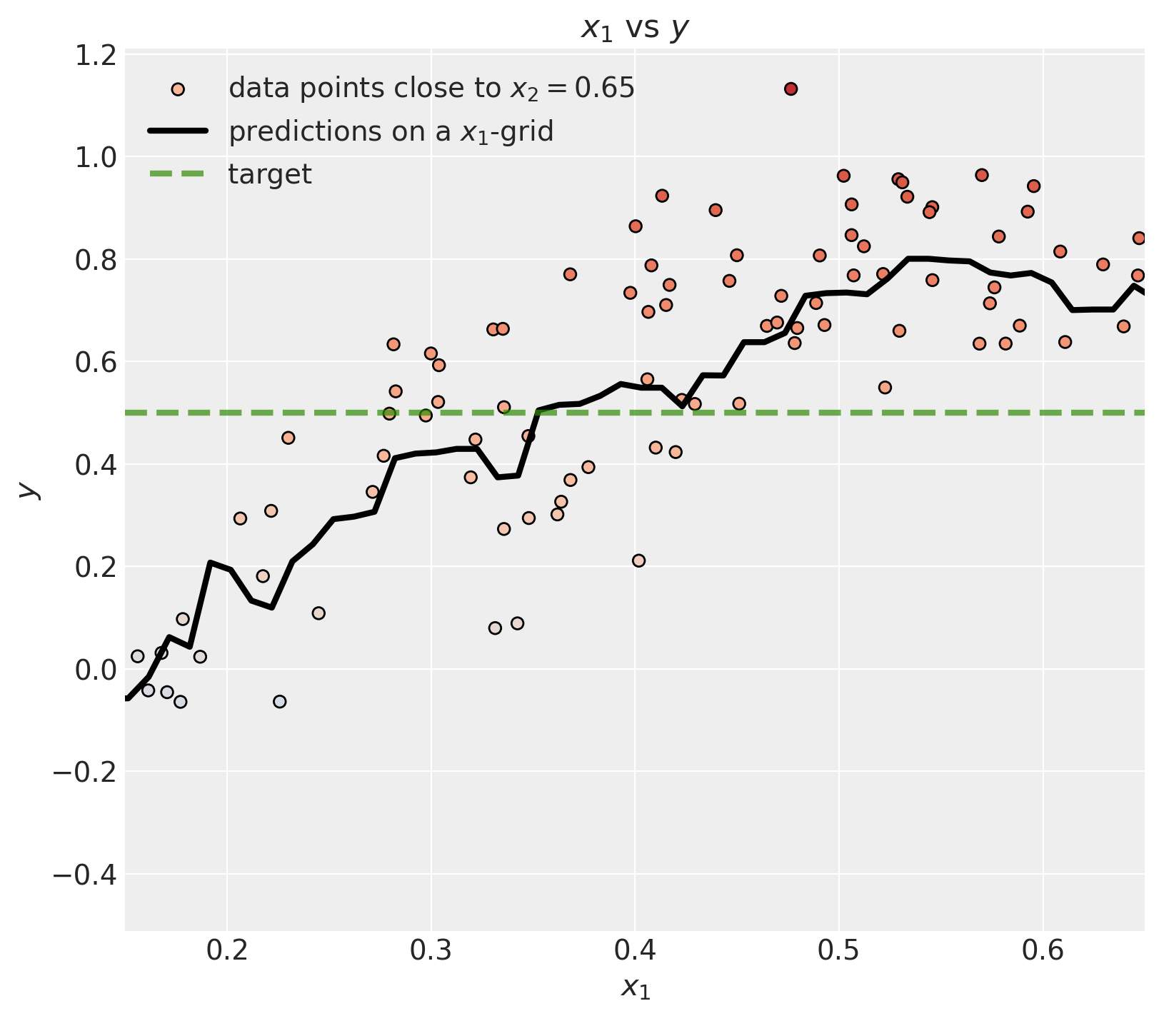 ax.set(xlabel=r"$x_1$", ylabel=r"$y$", title=r"$x_1$ vs $y$", xlim=(0.15, 0.65));