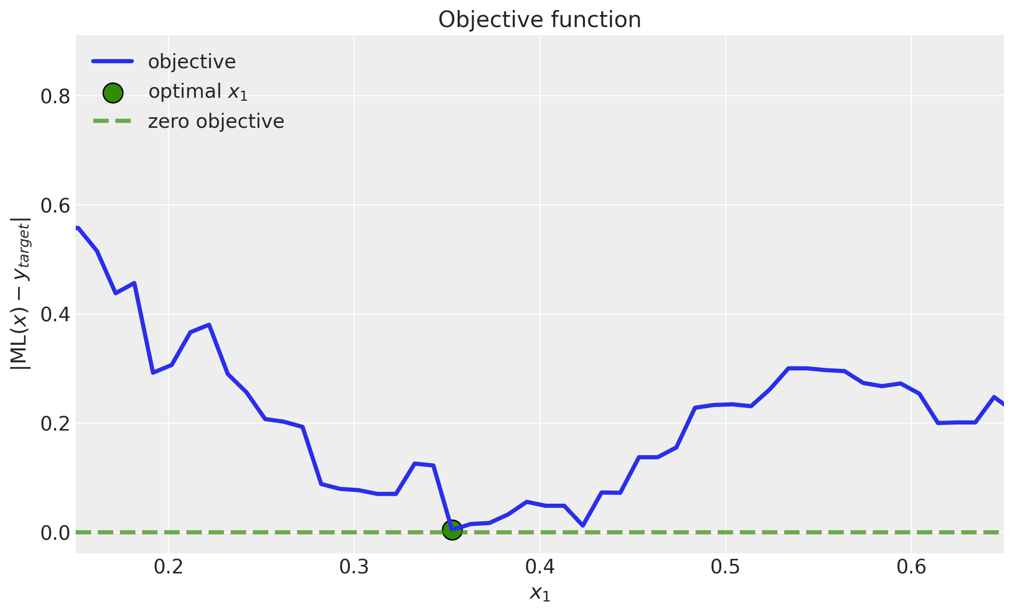 Now we can use scipy.optimize.minimize to find the value of \(x_1\) that minimizes the difference between the predicted value of the model and the target value.